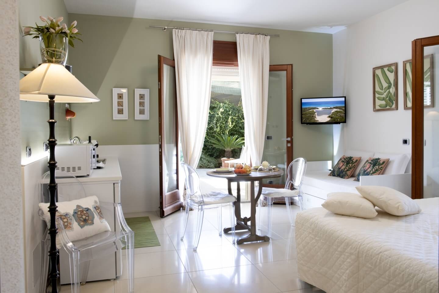 Rimediu Suite is a refined independent room of 30 square metres with kitchenette and carefully furnished, on the ground floor of the building where the "big brother" Rimediu Grande is also located and, on the same level, the adjacent Rimediu Piccolo, with which you can annex as a dependance, giving more flexibility and comfort to your holiday.